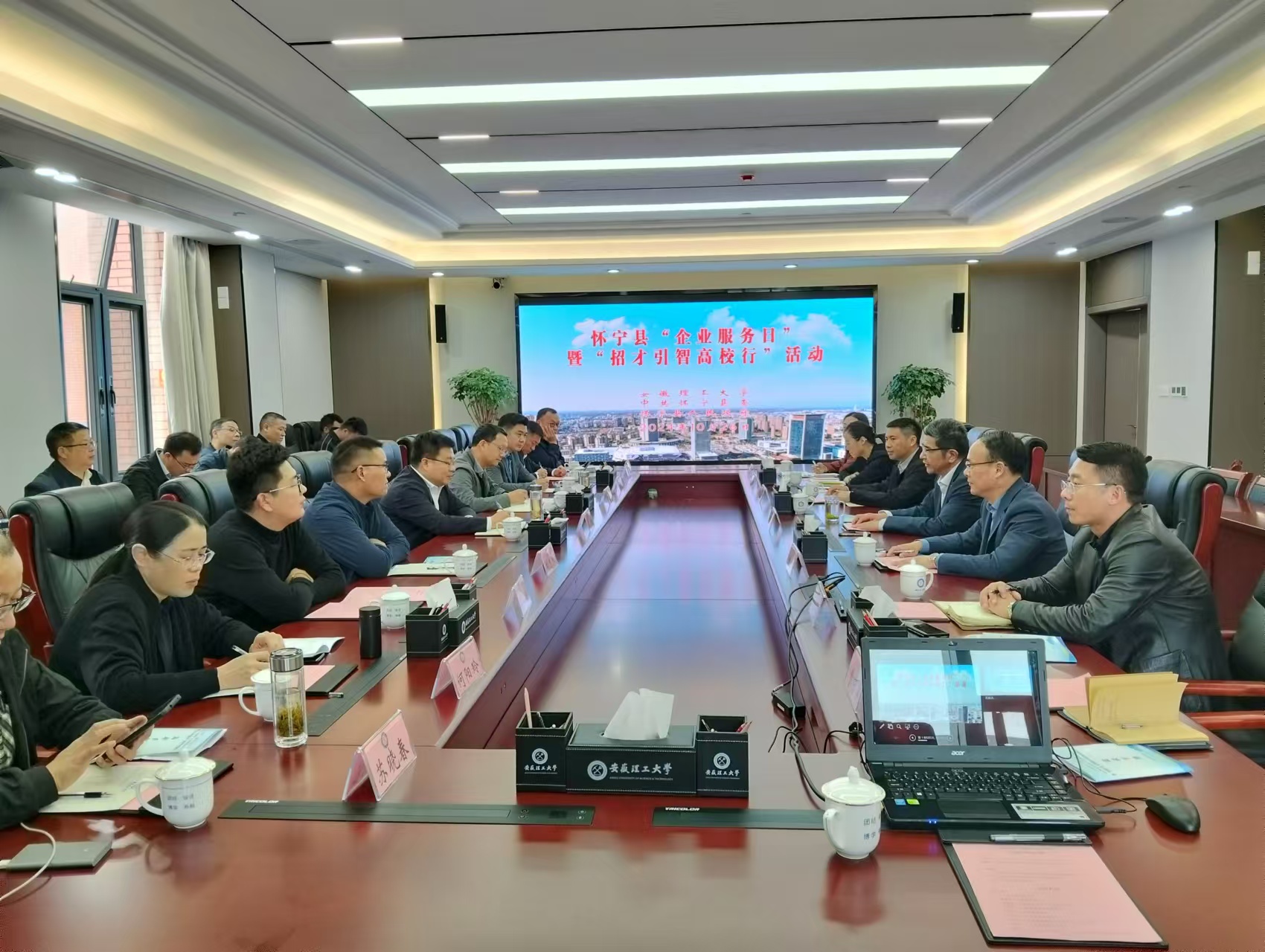 代瑜对学校的热情接待表示衷心感谢,对安徽理工大学在人才培养、科学研究、社会服务等方面取得了丰硕成果表示由衷钦佩。谭宪锋介绍了怀宁县情及相关产业发展情况,指出此次来校招才引智旨在推进人才强县、产业兴县,热切期待学校广大毕业生及优质创新资源汇聚到怀宁创新创业、奋斗出彩。
