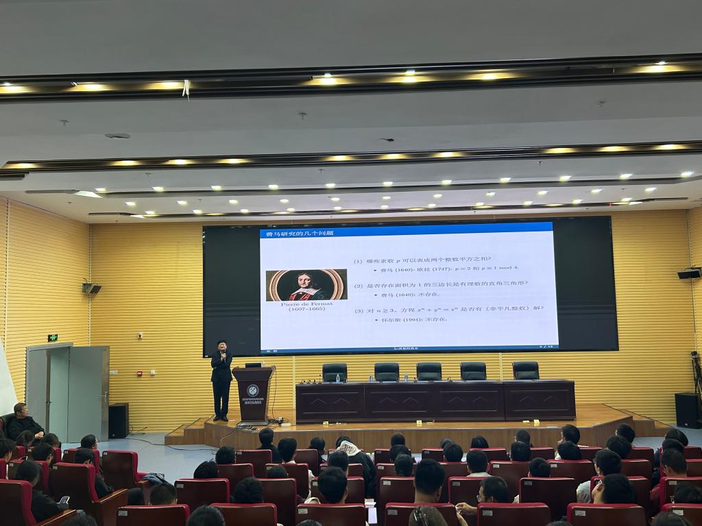报告中,田野院士从费马研究的三个著名问题入手,介绍了“L-函数”的起源,由此引入了“同余数问题”,并针对该问题的三种特例与师生进行了互动,提高了现场师生的学习兴趣。随后,田野院士又引入了“同余数的BSD猜想”,在深入浅出讲解的同时告诉同学们这个猜想还是公开的,鼓励有兴趣的同学投身于代数数论的研究中。田野院士介绍了“欧拉-黎曼zeta函数”的由来,进而引出了“L-函数”理论,详细介绍了牛顿和莱布尼茨所建立积分理论对于“L-函数”理论研究的影响,由此阐述了解析数论的起源,展现了它的重要性及其在数学发展进程中的重要作用。他还介绍了近年来“L-函数”理论的研究进展,其与半纯延拓的联系,与椭圆曲线的“L-函数”理论和“BSD猜想”之间的深刻内在联系。