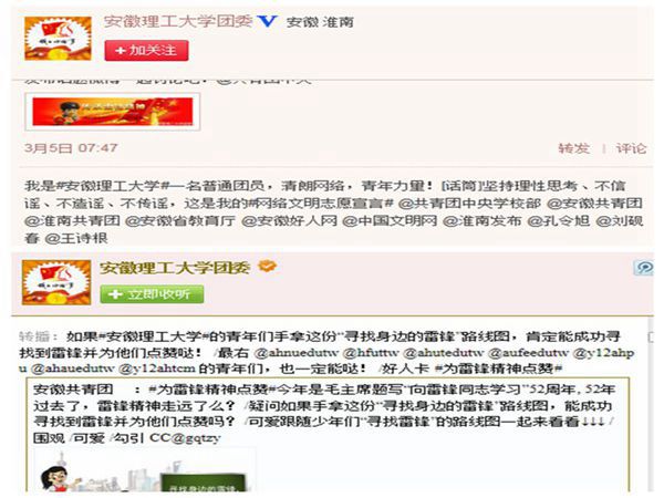 校团委响应团中央关于深入推进青年网络文明志愿行动的部署,搭平台、强队伍、建机制,广泛组织动员青年志愿者成为注册志愿者和网络文明传播志愿者,利用微信、微博等新媒体平台,发布《清朗网络·青年力量倡议书》,号召广大团员青年在互联网上积极发声,用文明语言和理性态度宣传正面思想、驳斥错误言论,主动弘扬正能量,发出青年好声音,做时代好网民。编写发布了“为雷锋精神点赞”、“寻找身边的雷锋”等系列文章,在网络和新媒体平台上吸引了大批青年关注和参与。3月10日,校团委在微信公共服务平台“文明安理”发布的共青团新媒体工作室招新文案获得团中央点赞,作为典型案例在3月11日被共青团中央官方微信推送给了全国团组织和团干部。