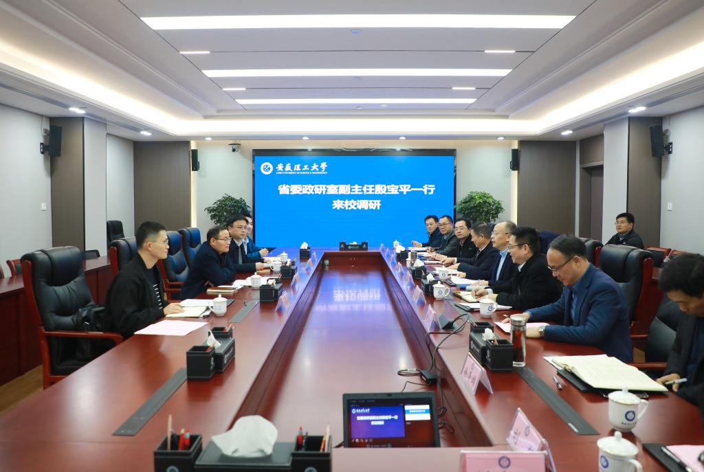 殷宝平在听取了汇报后,对我校近年来的发展表示充分肯定。他强调,我校工科办学优势明显,科教融汇、产教融合、医工交叉人才培养模式深入推进,“三千工程”校企联合培养研究生让人耳目一新,学科建设、人才引育、科技创新等方面成果丰硕,希望学校进一步聚焦学科建设牵引,抢抓教育强国建设战略机遇,统筹推进教育、科技、人才一体发展,为奋力谱写中国式现代化安徽篇章贡献力量。他表示,省委政策研究室将充分吸纳学校的意见建议,做好相关服务保障工作。
