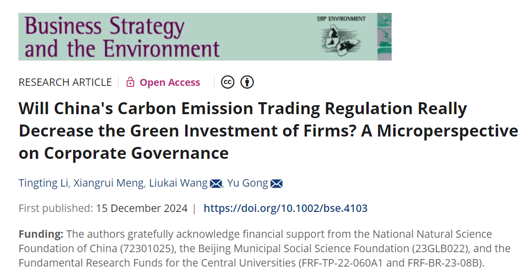 近日,我校2022级博士研究生李婷婷以第一作者身份,在国际学术期刊《Business Strategy and the Environment》(中科院一区TOP期刊,2023年影响因子12.5)发表了题为《Will China’s carbon emission trading regulation really decrease the green investment of firms? A micro perspective on corporate governance》的论文。研究探讨了中国碳排放交易(CET)试点政策对企业绿色投资支出(GIE)的负面效应,并从公司治理内外部机制的微观角度分析了企业创新能力和碳交易市场效率的调节作用。论文以北京科技大学汪刘凯副教授和南安普顿大学龚宇教授为通讯作者,以安徽理工大学为第一单位。