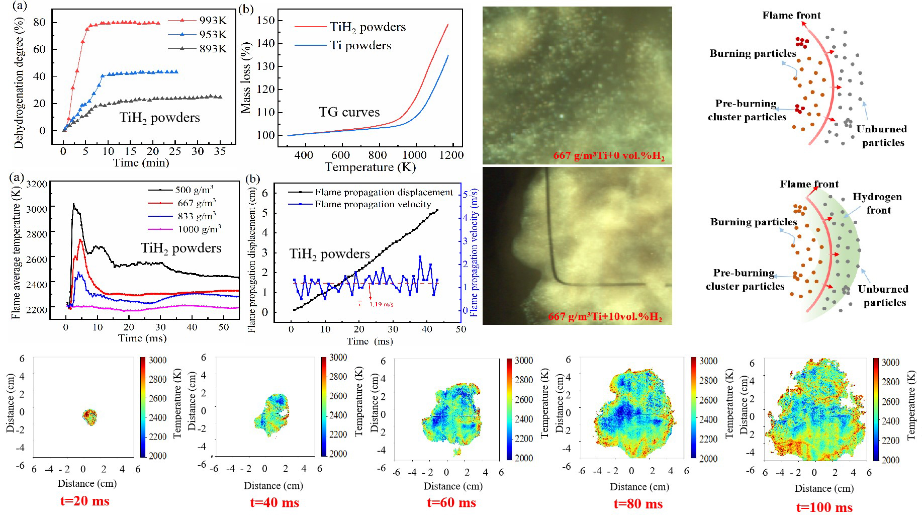 储氢合金被誉为“会呼吸的金属”,泛指在一定温度和压力条件下,能大量可逆吸收、储存和释放H2的金属间化合物,具有储氢密度高、储运便利和可循环利用等特点,在能源电力、燃料电池、航空航天和含能材料等领域具有广阔的应用前景。TiH2是目前最常用的一类储氢合金材料,在生产、储存和使用过程中通常以微纳米级尺度存在,受外界能量刺激时极易发生粉尘爆炸。程扬帆教授课题组前期研究发现,与传统粉尘燃爆过程中粉尘颗粒的单一燃烧反应不同,TiH2颗粒在燃爆过程中伴随着放氢反应以及金属颗粒/H2的混合燃爆反应。论文系统地研究了TiH2、基体金属Ti以及Ti/H2气-固两相混合物的火焰传播特征,利用自主研制的爆炸瞬态温场测试系统实现了金属粉尘爆炸温度场的动态重构,验证了氢含量与存在形式对TiH2粉尘气-固两相燃烧反应动力学的影响,并揭示了放氢反应在TiH2粉尘云燃爆过程中的互馈效应和协同反应机制。研究结果对储氢合金粉尘爆炸防控具有重要的理论意义和工程应用价值。