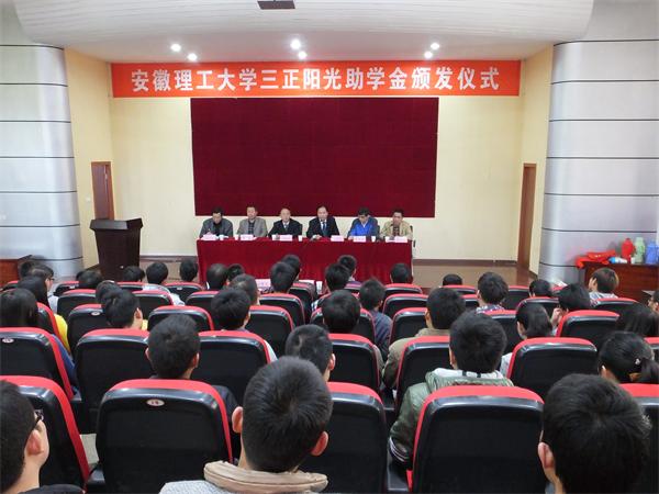 三正阳光助学金是由安徽省高新技术企业三正集团股份有限公司出资,于2012年开始在我校设立的,用于资助我校机械工程学院和电气与信息工程学院学习成绩优良、家庭经济困难的学生,今年是第三次颁发。