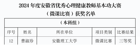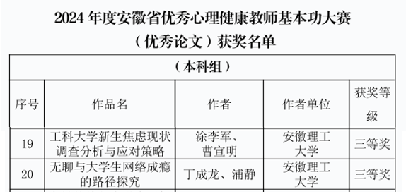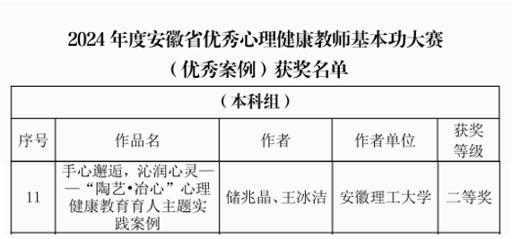 近日,安徽省教育厅公布了2024年度优秀心理健康教师基本功大赛获奖名单。我校材料科学与工程学院储兆晶和学生处王冰洁撰写的《手心邂逅,沁润心灵——“陶艺·冶心”心理健康教育育人》主题实践案例荣获优秀案例本科组二等奖,化工与爆破学院曹淑珍荣获微课比赛本科组三等奖,安全科学与工程学院涂李军和曹宣明撰写的论文《工科大学新生焦虑现状调查分析与应对策略》及电气与信息工程学院丁成龙和学生处浦静撰写的论文《无聊与大学生网络成瘾的路径研究》荣获优秀论文本科组三等奖。