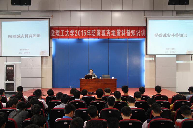 为进一步深入宣传地震科普和防震减灾知识,增强广大师生的防震减灾意识,提高自救自护能力,在“5.12”我国第七个“防灾减灾日”来临之际,4月29日下午,校保卫处、学生处联合淮南市地震局在北校区学术报告厅为我校师生举办了“防震减灾地震科普知识”讲座。
