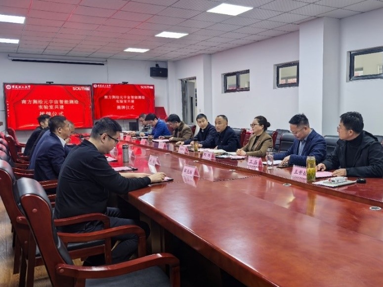 3月12日上午,学校与南方测绘集团共建元宇宙智能测绘实验室签约揭牌仪式在求本楼北503会议室隆重举行,为学校八十华诞献礼。校党委常委、副校长张平松出席仪式并致辞。南方测绘集团副总裁郭宝宇、合肥分公司总经理吴兆龙,校合作发展处负责人,空间信息与测绘工程学院领导班子成员、教师和学生代表参加签约揭牌仪式。仪式由空间信息与测绘工程学院负责人主持。