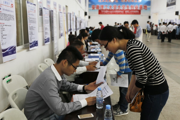 5月9日上午,由我校联合淮南市经信委、淮南市教育局主办,校毕业生就业工作处、淮南市中小企业公共服务中心承办,淮南市求实人力资源服务有限公司协办的“2015全国中小企业百日招聘高校毕业生”安徽理工大学专场招聘会在我校大学生创业基地成功举行。200余名校毕业生前来应聘。
