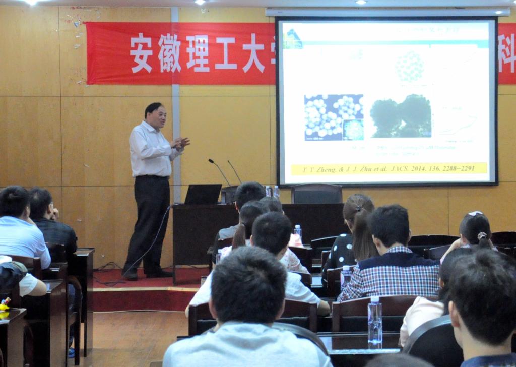 报告会上,朱俊杰教授从“电化学细胞传感器用于白血病细胞的高选择检测及细胞表面死亡受体的定量检测”、“利用多功能杂化纳米探针实现多种急性白血病细胞的同时高灵敏检测”、“功能化的金/量子点核-星结构纳米探针用于人血清中金属基质蛋白酶(MMP-2)的双通道检测”、“以DNA复合体为纳米开关的药物载体的构建及在癌症细胞内的靶向运输与药物可控释放”、“高密度聚乙二醇修饰的CuS@mSiO2纳米材料用于药物运输和光热疗”5个方向阐述了近年来纳米材料在制备、组装、功能化、电化学和生物传感方面的最新研究进展。会后,部分教师和学生就感兴趣的问题和朱俊杰教授作了现场交流。