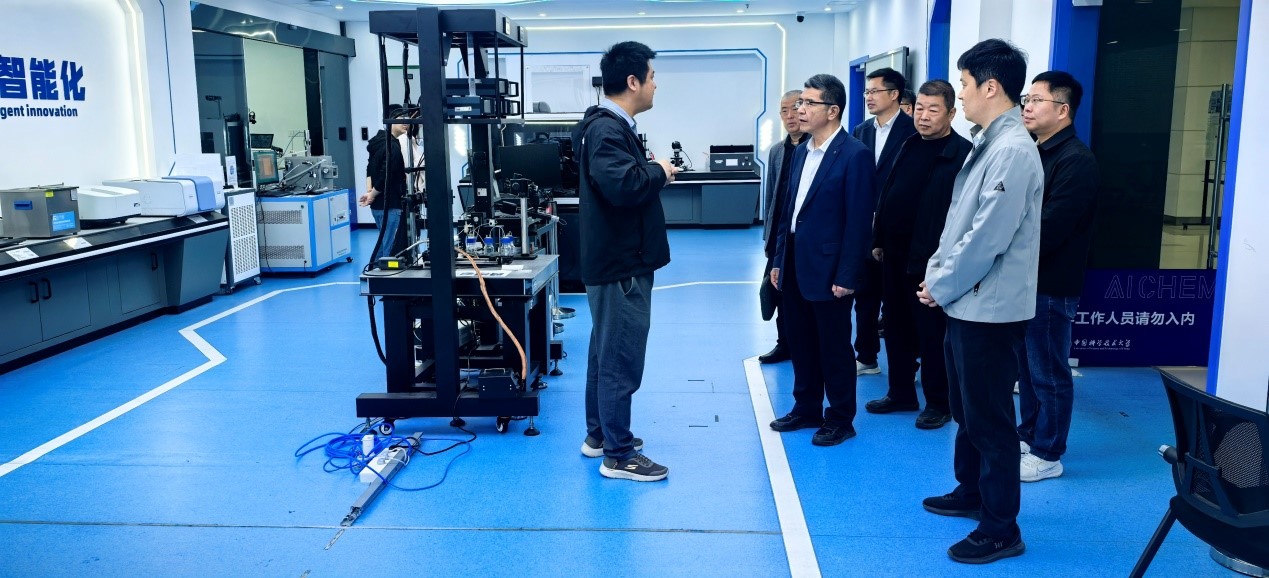 调研交流期间,董雨实地考察了机器科学家团队实验室,实验室工作人员详细介绍了团队研制的全球首个数据智能驱动的机器化学家平台,以及在新药物、新材料、新物质发现与创制方面取得的突破性进展。董雨对中科大机器科学家团队在人工智能赋能化学学科研究新范式方面取得的成绩给予了充分肯定。