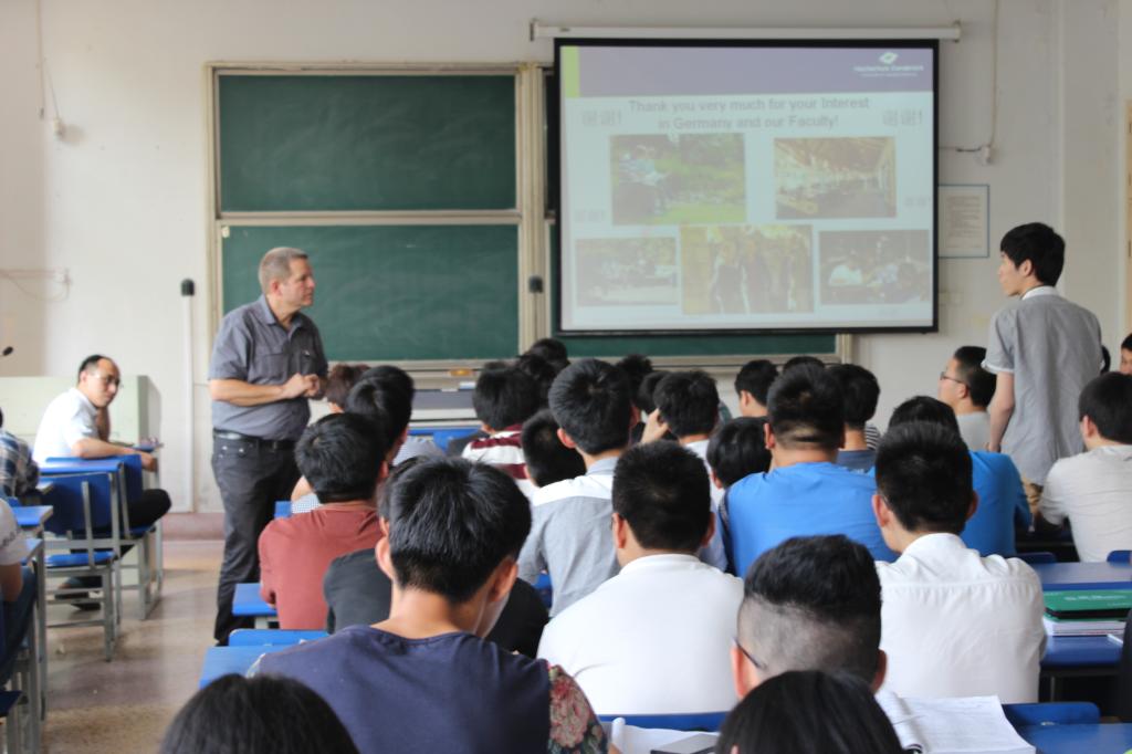 19日下午,Anlauf教授为测绘学院2014级学生作了一场题为《Impression of Germany》的报告。Anlauf在报告中向同学们介绍了德国的地理、人口、城市、文化、饮食和教育,德国高等教育体系设置并详细介绍了奥斯纳布吕克应用科技大学接纳外国留学生的具体办法。报告结束后,Anlauf回答了同学们的提问,并鼓励大家一定要学好英语。