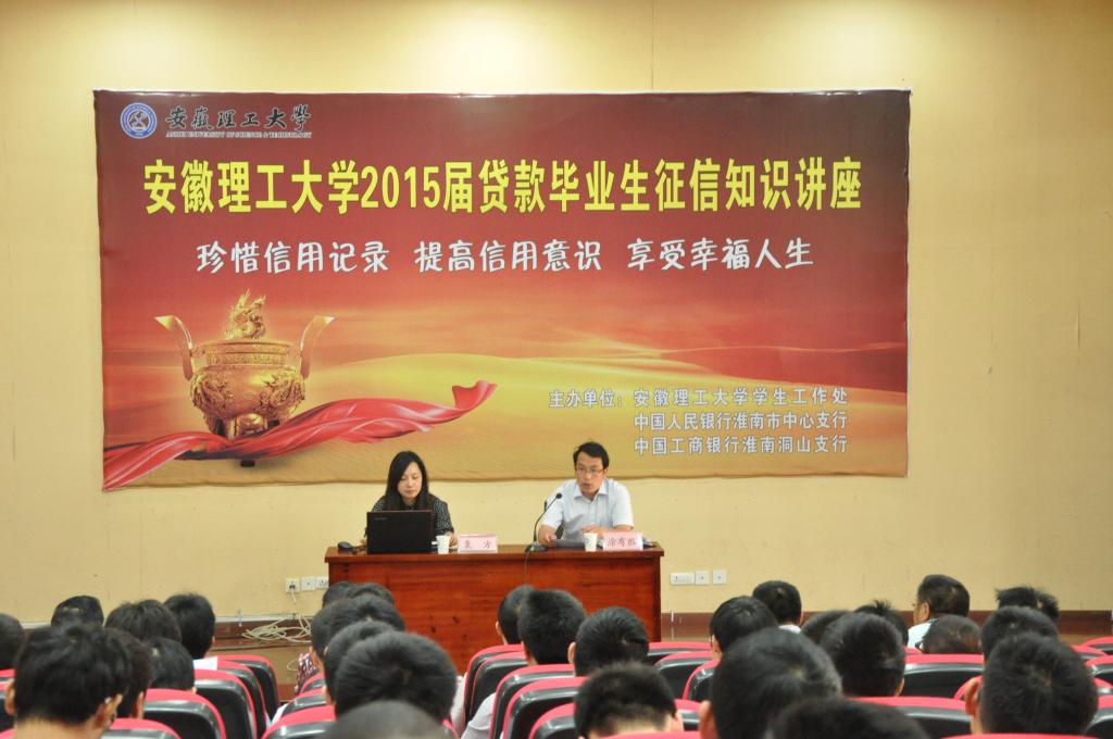 5月25日下午,由安徽理工大学与中国人民银行淮南市中心支行、中国工商银行淮南洞山支行共同主办的“诚信校园行”活动暨2015届贷款毕业生征信知识讲座在六角楼报告厅举行。活动共分为征信知识宣讲、现场互动交流、签订诚信承诺书和“怀感恩之心、做诚信之人”主题签名活动等四个环节进行。