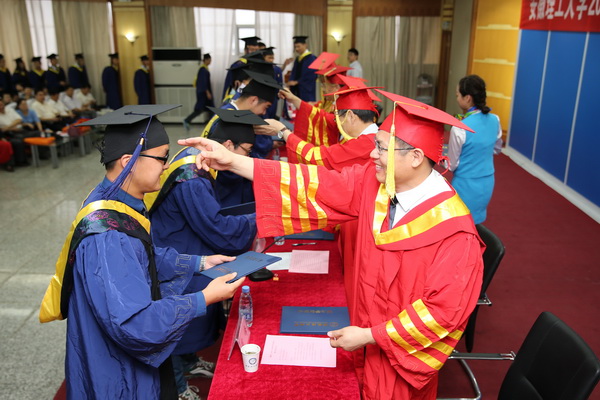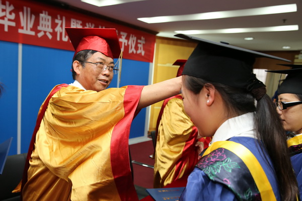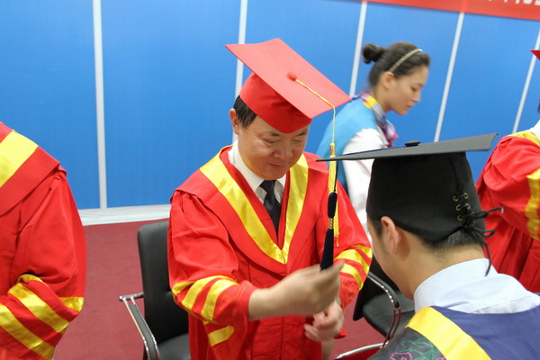 毕业典礼结束后,现场的博士毕业生、硕士毕业生依次走上主席台,由校领导为他们授予学位、扶正流苏。