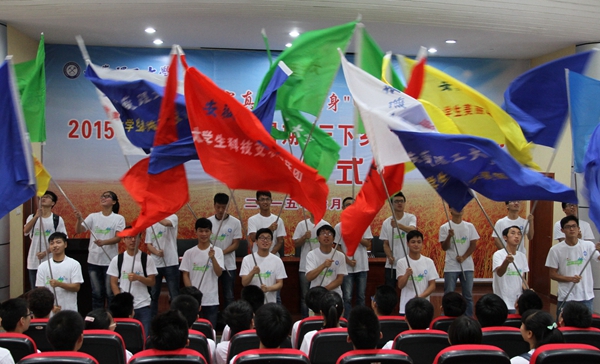 校党委书记颜事龙宣布安徽理工大学2015年暑期“三下乡”社会实践服务团队出征。颜事龙、叶醒狮分别为国家级、省级和校级重点团队授旗。