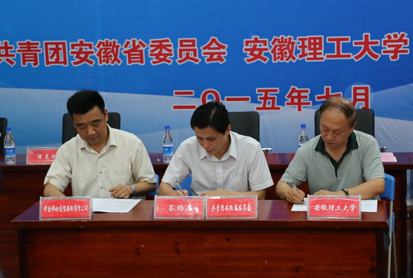 杨正、叶醒狮、侯克刚分别代表安徽团省委、安徽理工大学、中国移动安徽有限公司三家单位签订了共建合作协议。根据三方共建协议,三家共建单位将在推进学校共青团工作网络新媒体战略转型、促进青年创新创业、研发移动互联网产品、加强校园信息化建设等方面展开为期三年的合作。