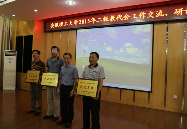 王洪为获得安徽省教育工会“模范职工小家” 称号的测绘学院分工会授牌,并为获得“2013-2014年度工会工作先进集体”的单位颁发奖牌。