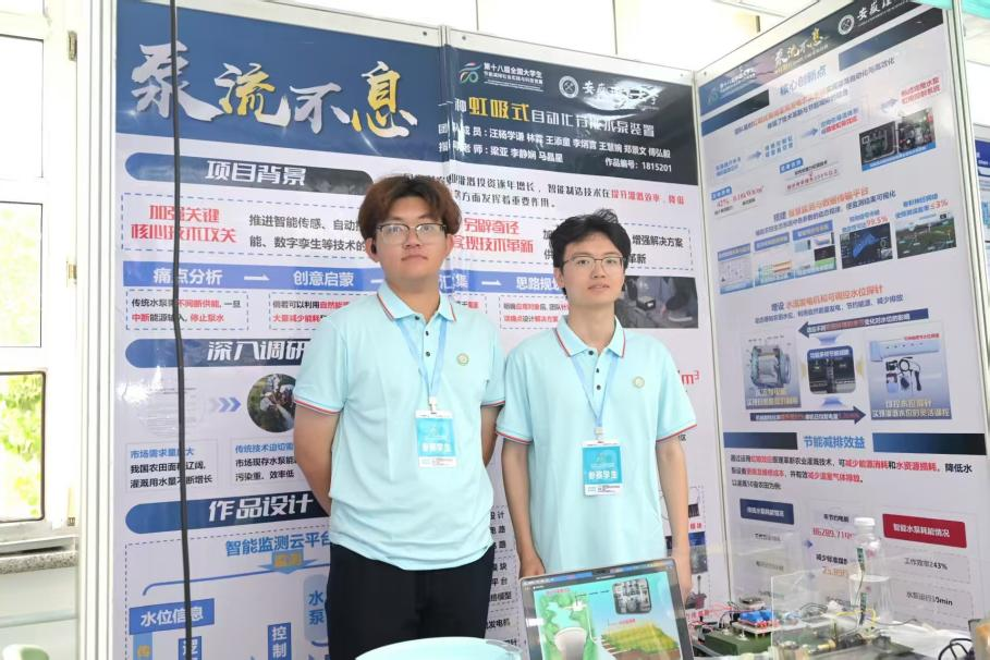 本次大赛有692所高校的近8000支队伍参加,最终有340件作品参与全国总决赛。数学与大数据学院汪杨学谦、林霖、王添童等同学申报的的作品《泵流不息——一种虹吸式自动化节能水泵》(指导教师:梁亚、李静娴、马晶星)获得全国一等奖,这是学校继2012年以来,时隔十三年再次获得一等奖;矿业工程学院涂昊翔、辛浩、张明宇等同学申报的《基于多源感知的隧道掘进参数高效调控系统》(指导教师:黄鑫、贾茹、庞冬冬)等2项作品获得全国二等奖;空间信息与测绘工程学院刘华炎、罗卓然等同学申报的《光随人动,节能有道—基于智能拖鞋穿戴触发与空间定位的智能照明系统》(指导教师:李静娴、胡豪杰、唐鹏飞)等6项作品获得全国三等奖。