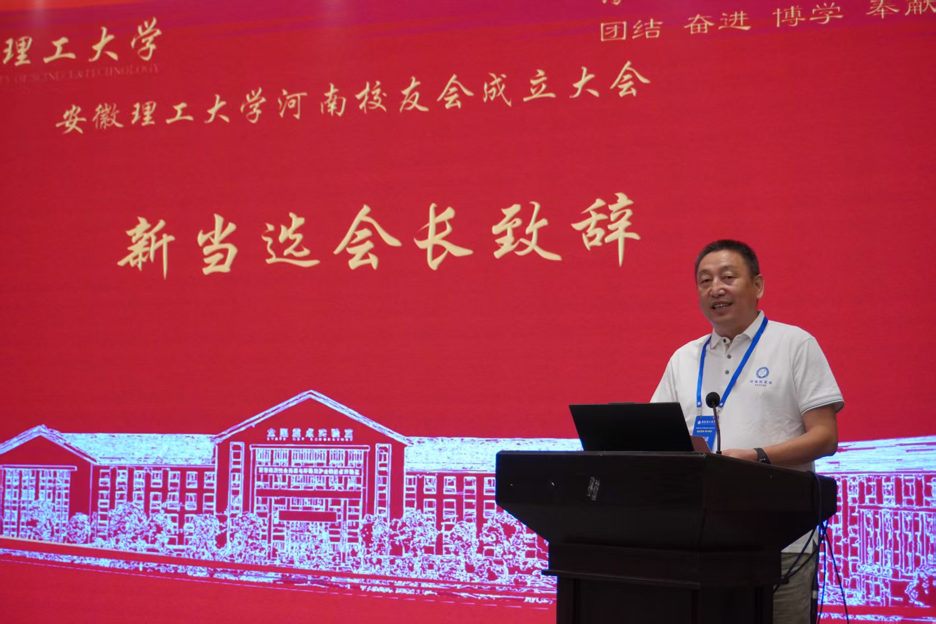 袁亮致辞,他从校史校情、创新举措、展望未来三个方面,介绍了学校八十载建设历程、办学成就与规划愿景,讲述了新时代安理人的奋进故事与可喜成就。他指出,河南兼具深厚历史文化底蕴、坚实产业基础与突出区位优势,一大批安理人汇聚于此,奋力勃发,取得了骄人业绩。校友是学校发展的见证者与支持者,学校高度重视校友工作,积极助力校友的成长和进步,校友有所呼,母校有所应。希望在豫校友依托校友会平台,同心同向,将其打造成情感共同体、文化共同体、发展共同体,为河南经济社会发展及母校建设贡献力量。