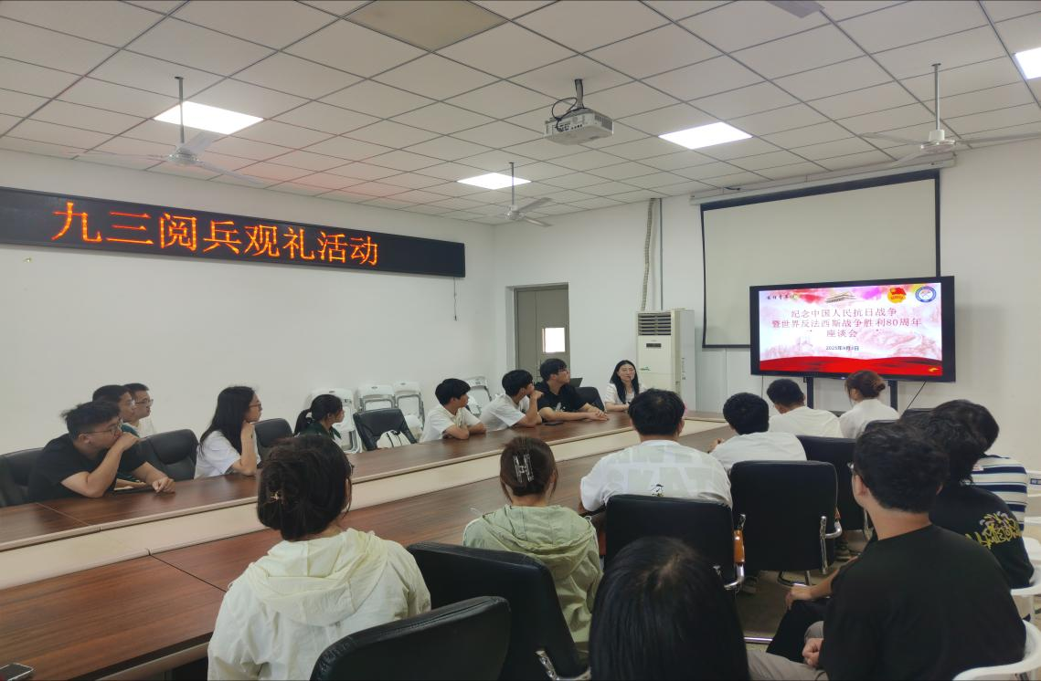 9月3日上午,纪念中国人民抗日战争暨世界反法西斯战争胜利80周年大会在首都北京隆重举行。校团委组织学生骨干在厚德馆D303会议室,怀着对祖国深深的热爱和祝福之情,集中收看了直播盛况,并通过座谈会的形式开展了纪念活动。各校级学生组织40余名学生参与了活动。