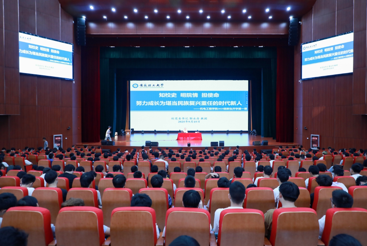 9月15日上午,校党委书记、机械工程学科带头人郭永存教授在双创中心报告厅围绕“知校史 明院情 担使命 努力成长为堪当民族复兴重任的时代新人”主题为机电工程学院2025级全体新生和全院教职工讲授开学第一课。