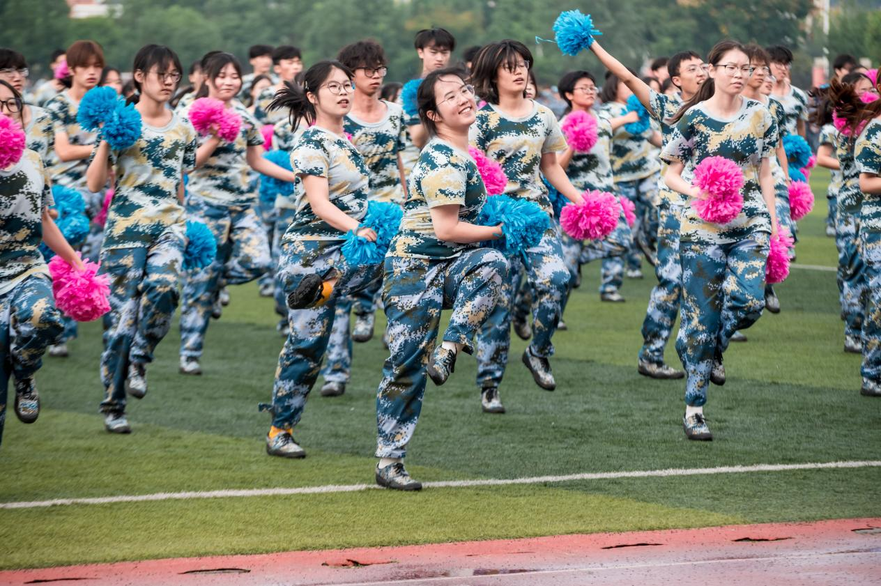 随着学生方阵摆出“10、9、8、7……”数字倒计时字样,军训汇报表演正式开始。花样操方阵编排巧妙,依次呈现“校徽”“团结 奋进 博学 奉献”“永远跟党走 争创双一流”“I love AUST”等字样和图案,表达了2025级新生对学校的热爱之情和对学校创建“双一流”的真挚期许和祝福。