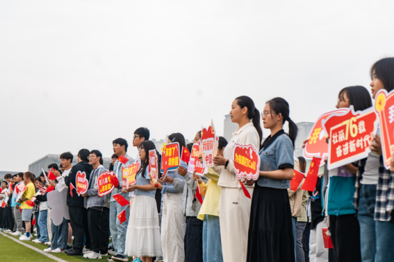 8时整,《义勇军进行曲》响彻全场。擎旗手振臂展旗的瞬间,五星红旗如火焰般跃动着迎向朝阳,2000多双眼睛共同追随那抹中国红缓缓攀升。正如一位参与同学说道:“今天,我们仰望的不仅是飘扬的国旗,更是安理人与祖国同频共振的壮阔征程。”当国旗升至杆顶,全场自发唱响国歌,声浪裹挟着“祖国万岁”“安理加油”的呐喊直冲云霄。