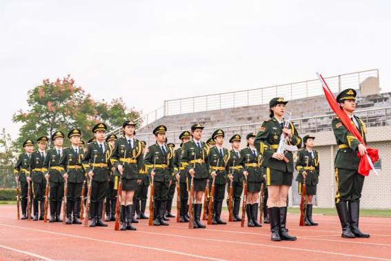 “正步走!”随着分列式指挥刀划破晨空,校国旗护卫队36名队员肩扛礼宾枪,踏着《分列式进行曲》的鼓点铿锵前行。橄榄绿军装与鲜红绶带交相辉映,踢腿高度误差不超2厘米的整齐步伐,在塑胶跑道上踏出震撼人心的韵律。当护旗方阵以“品”字形阵列挺立于旗杆前,晨光为他们镀上金边的剪影。