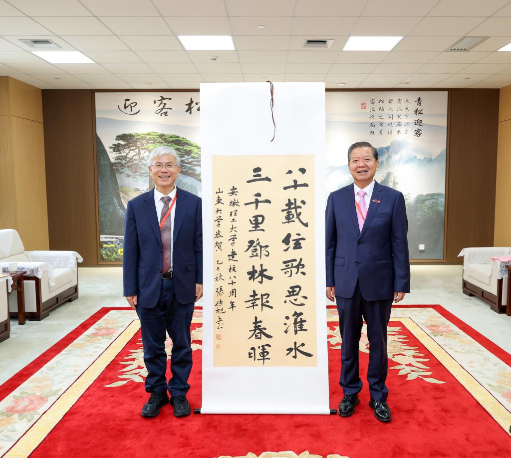 李术才向学校建校80周年表示热烈祝贺,并高度评价了学校聚焦优势特色争创“双一流”的举措和成果。他表示,两校一直保持着良好的合作交流关系,此次捐赠的书画作品,将以艺术为载体,传递山东大学师生对安徽理工大学的美好祝福。希望未来持续推动两校资源共享、优势互补,实现双方高质量发展。