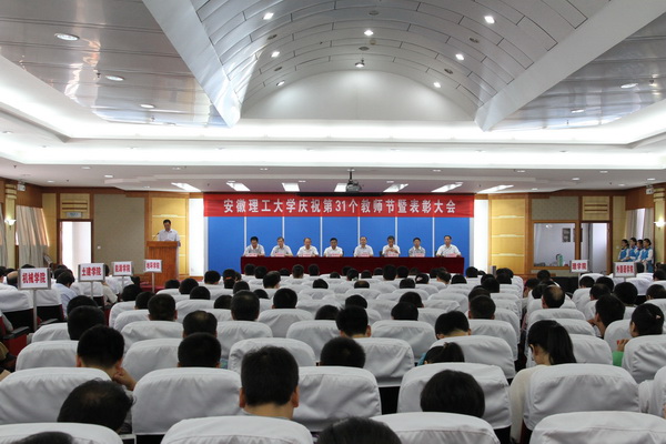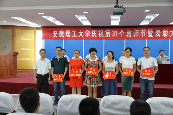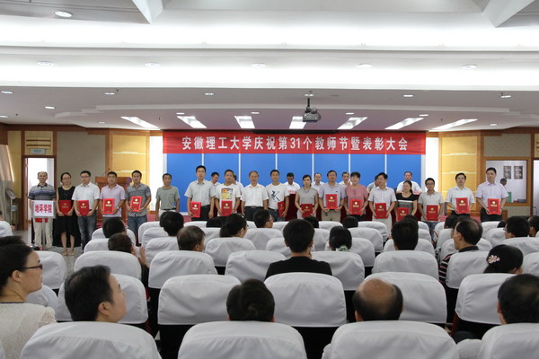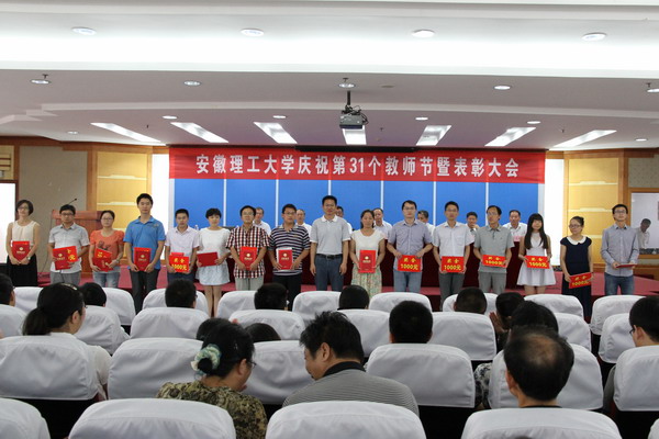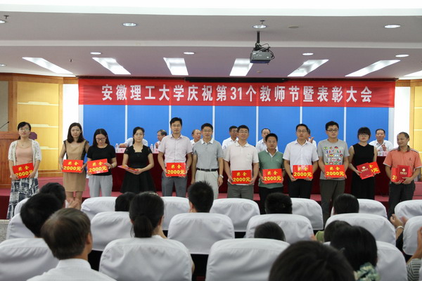 9月9日上午,学校在9楼报告厅隆重召开庆祝第31个教师节暨优秀教师、优秀教育工作者和青年教师教学基本功竞赛获奖教师表彰大会,表彰了校优秀教师53名、优秀教育工作者37名、省第二届普通本科院校青年教师教学竞赛获奖者3名、校青年教师教学基本功竞赛获奖者33名。校党委书记颜事龙、校长郭永存、副校长叶醒狮、党委副书记王洪、副校长王其东、副校长孟祥瑞、纪委书记周峰出席庆祝大会,并为受表彰的优秀教师、优秀教育工作者和教学基本功竞赛获奖教师颁奖。表彰大会由人事处处长宫能平主持。