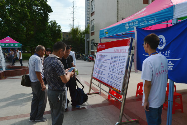 校学生会志愿者在北校区迎新报到站为新生和家长提供附近宾馆入住参考信息