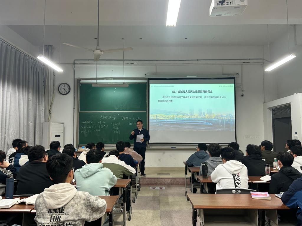 在听课过程中,余玉刚认真记录课程要点,细致观察课堂互动与学生听课状态,对袁晓凤老师的教学准备、课堂组织及学生专注度给予了充分肯定。在认真听取教师的讲授后,他以“全过程人民民主的底层逻辑与独特优势”为切入点,通过中西方民主政治制度的详尽对比,生动阐释了全过程人民民主的连续性、整体性、真实性和有效性,引导学生深刻认识全过程人民民主作为最广泛、最真实、最管用的社会主义民主形态的深刻内涵与制度优势。
