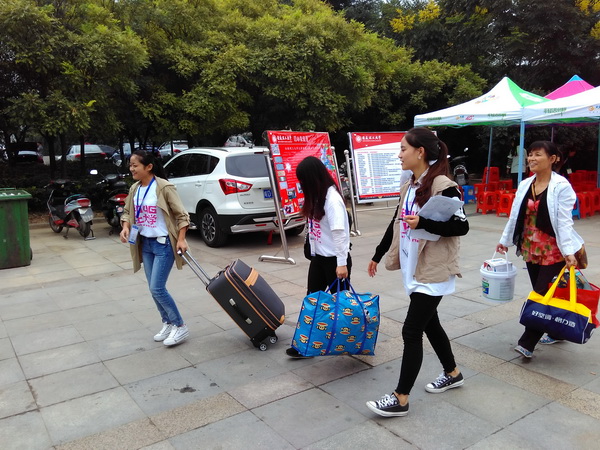 每天清晨,迎新志愿者同学在团委老师的组织下,佩戴证件、统一着装,穿梭于火车站、汽车站、火车东站等三个接站点和熙熙攘攘的校园内,肩扛手拉帮新生搬运行李、指引道路、介绍流程,为新生在踏入学校的第一刻,送上最热烈的欢迎。