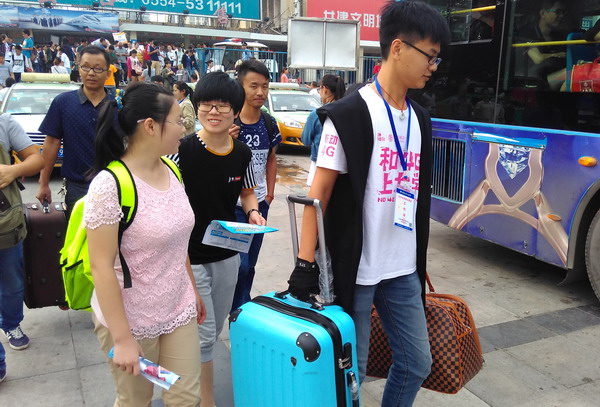 大学生爱心社的志愿者带领新生及家长前往登车点