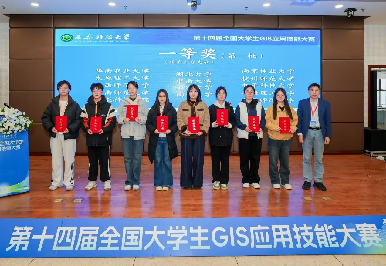 11月14日至16日,第十四届全国大学生GIS应用技能大赛在西安科技大学隆重举行。经过激烈角逐,由我校2023级地理空间信息工程专业何秀君、杨睿、马政楠、赵程烨四位同学组成的参赛团队,在李冠男、卢秀两位老师的悉心指导下,凭借扎实的专业功底、娴熟的操作技能和出色的团队协作,从众多强校中脱颖而出,荣获全国一等奖,为学校赢得了荣誉。这是我校在该项竞赛中连续两年荣获一等奖,充分展现了学校在GIS领域教学的显著成效。