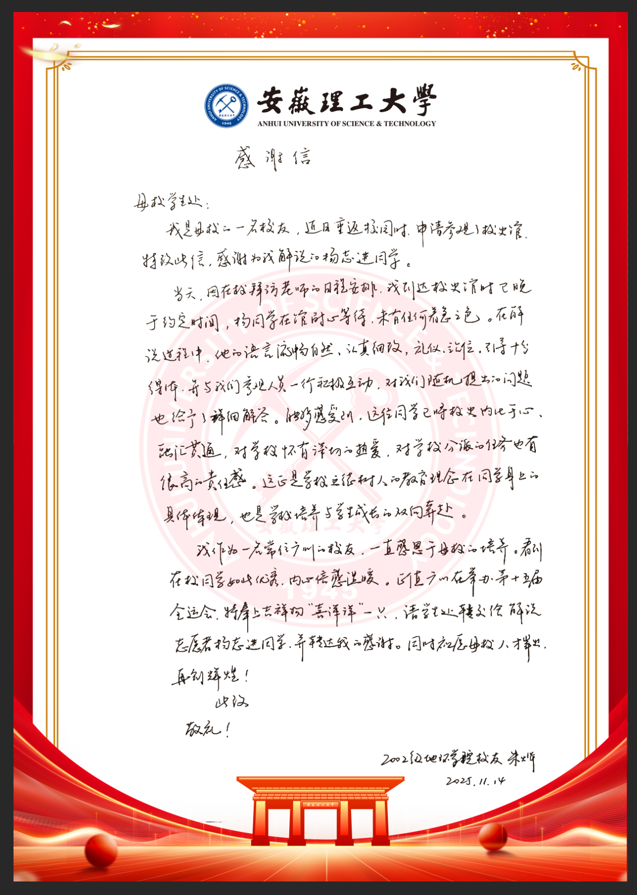 一封感谢信,是安徽理工大学育人成果的鲜活缩影;一次志愿服务,是“立德树人”理念的生动实践。杨志进的坚守与热忱,是万千安理学子的真实写照;朱烨的感念与反哺,是无数校友与母校深厚情谊的具体体现。朱烨在信中衷心祝愿母校“人才辈出,再创辉煌”,这亦是所有安理人的共同期盼。母校赠予的从来不止课本知识,更是融入血脉的品格、刻在骨子里的温度,是阶梯与山峦的指引、雨伞与怀抱的守护、青春与平凡的接纳。从朱烨到杨志进,从二十年前的校园到如今的校史馆,这份珍贵的“赠予”在一代代安理人中不断传承,终将在岁月长河中生生不息,让新时代青年的责任与担当在实践中绽放更耀眼的光芒。