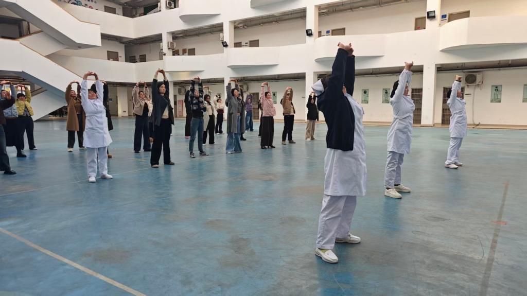 在专业医师的引领下,师生们一同练习八段锦传统养生功法,在舒缓的音乐中凝神静气、疏通经络,不仅学习了八段锦的基本动作,更在一呼一吸间放松了身心。