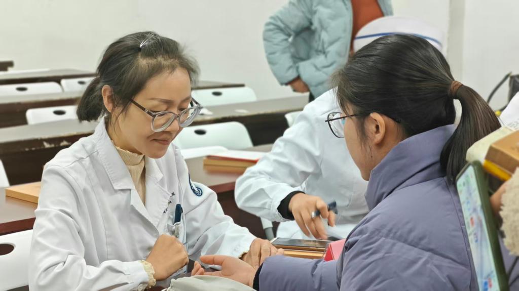 随后是最具吸引力的中医特色项目现场体验。中医把脉、面部刮痧、穴位按摩、耳穴压丸等项目均由第一附属医院的专业医师操作,医师们边讲解不同中医体验项目的原理和手法,边为现场师生提供个性化调理建议和一对一“沉浸式”体验。