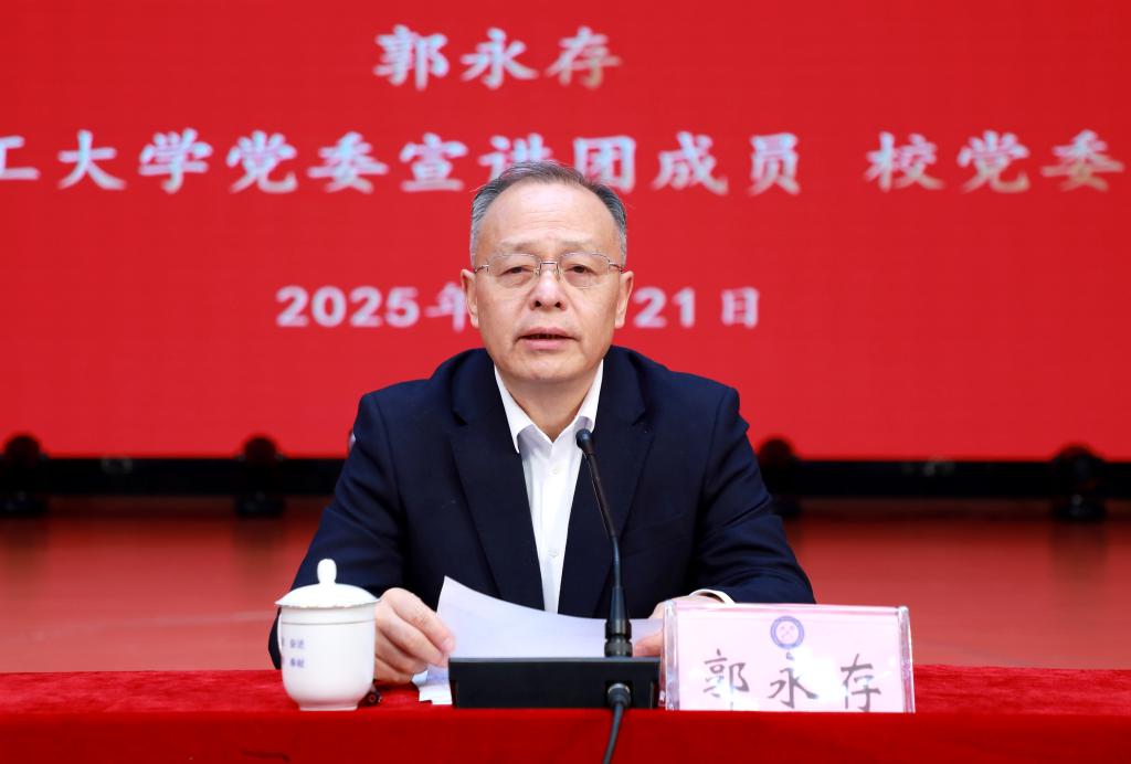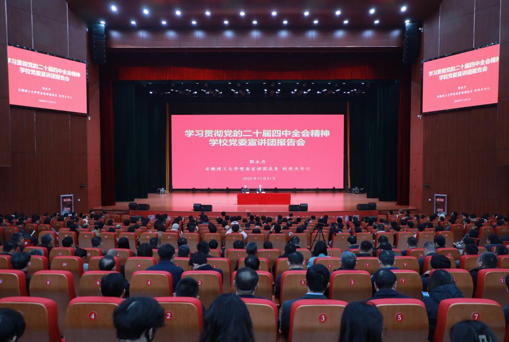 郭永存紧紧围绕学习贯彻习近平总书记在党的二十届四中全会上的重要讲话精神和全会《建议》,从全会的基本情况和重大意义、准确把握“十五五”时期在基本实现社会主义现代化进程中的重要地位、深刻领会“十五五”时期经济社会发展的指导方针和主要目标、全面理解“十五五”时期经济社会发展的战略任务和重大举措、坚持和加强党的全面领导等方面,着眼国际国内发展形势,紧密结合安徽发展实际,立足高等教育使命和学校发展实际,引用详实的数据案例和鲜活发展实践,对全会精神进行了系统阐释和深入解读。他要求全体党员领导干部和师生医务员工把学习贯彻党的二十届四中全会精神,同深入学习贯彻习近平新时代中国特色社会主义思想和习近平总书记考察安徽重要讲话精神以及习近平总书记关于教育的重要论述结合起来,同贯彻落实教育强国建设规划纲要、加快教育强省建设实施意见结合起来,按照学校第八次党代会工作部署,深入实施“1610工程”,在加速进军“双一流”建设行列、服务我省“三地一区”建设、助力全面建设美好安徽上展现新的更大作为。