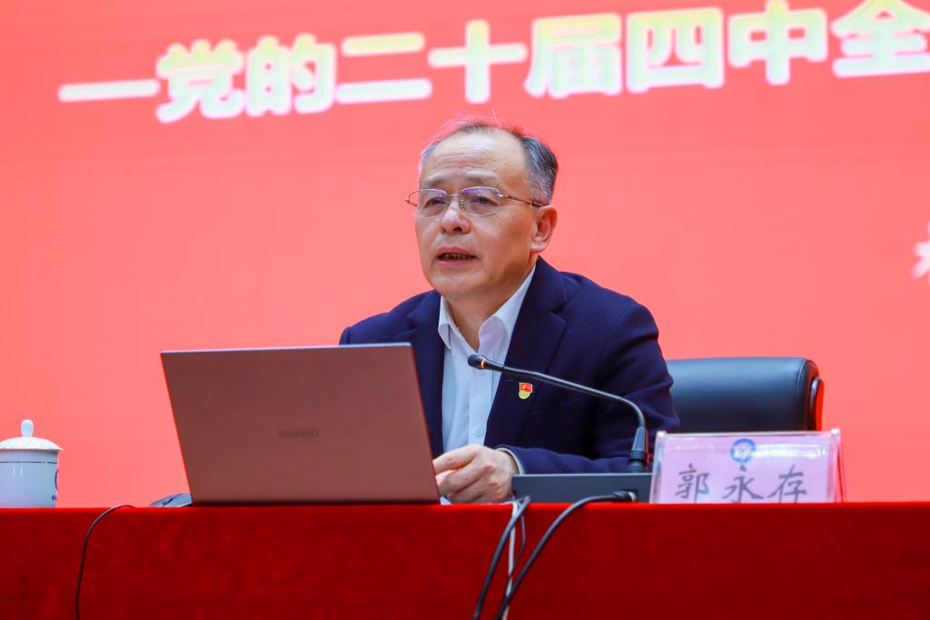 郭永存作了题为《深学细悟全会精神,实干笃行担当使命,努力成长为堪当民族复兴重任的时代新人》的党课暨思想政治理论课,重点围绕学习贯彻党的二十届四中全会精神,着眼国际国内发展形势,紧密结合安徽发展状况,立足高等教育使命和学校创新发展实际,引用详实的数据案例和鲜活的发展实践,对全会精神进行了系统阐释和深入解读。