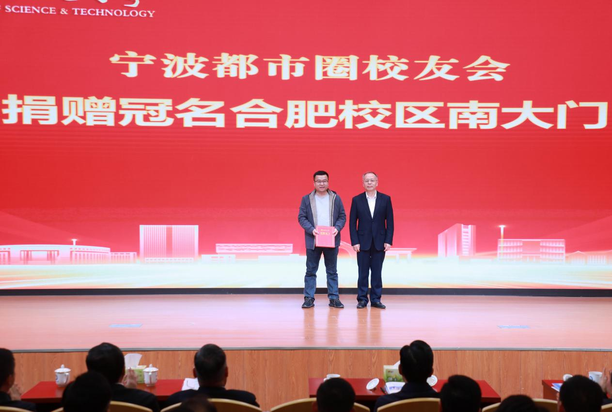 郭永存为宁波都市圈校友会、南京校友会,田胜利、欧阳雄等校友代表及美亚光电等企业代表颁发捐赠证书。