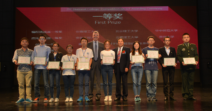 此次大赛包括创意赛、编程挑战赛和应用挑战赛三个竞赛项目。在编程挑战赛项目中,全国共有武汉大学、北京理工大学等19所高校、30支队伍、约130名师生参赛。我校于瓅老师带领指导的彭徽、杨维伟、张永芳团队和陈辉老师带领指导的王仲、林亚飞、王瑞国团队参加了编程挑战赛。决赛采用现场竞赛方式,各参赛队需在现场根据题目要求完成相应的代码设计,主要包含数据传输及无线多跳自组网等内容,着重考察其对物联网设备进行编程控制的能力。评委根据评分细则对各参赛队的表现进行评分。