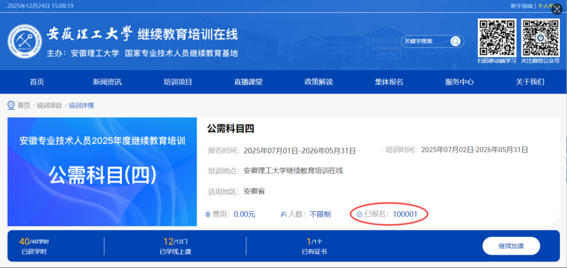 我校依托国家专业技术人员继续教育基地,开展安徽省专业技术人员继续教育2025年度公需科目公益性培训。截至12月24日,安徽理工大学继续教育培训在线报名参加培训超过10万人。