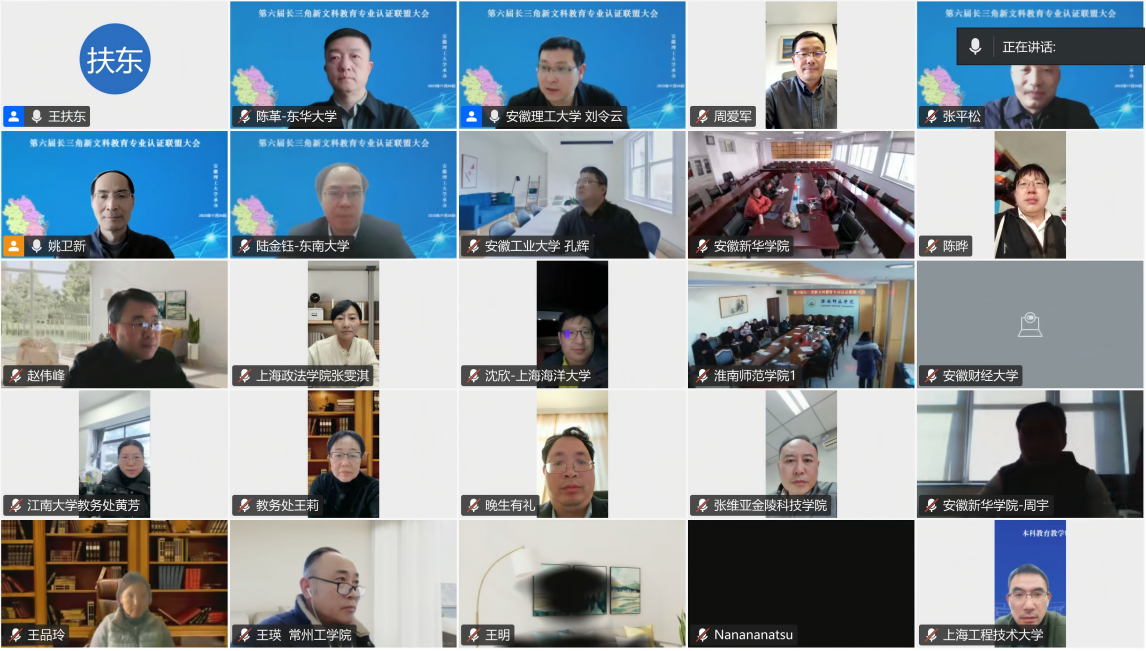 12月26日下午,由我校承办的第六届长三角新文科教育专业认证联盟大会以线上形式召开。校党委常委、副校长张平松出席会议并致辞。教育部教育质量评估中心副主任周爱军、东华大学副校长陈革、长三角新文科教育专业认证联盟理事长姚卫新,以及联盟成员高校校领导、教务处(评估办、质量办)负责人和认证专家等近200人参加会议。会议分别由联盟理事长姚卫新和我校教务处主要负责人分阶段主持。