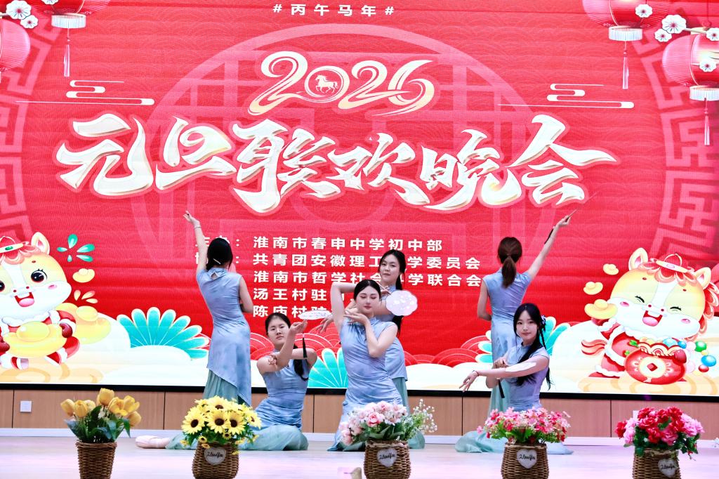 12月29日晚,由校团委联合谢家集区杨公镇汤王村、陈庙村驻村工作队共同走进汤王镇春申中学,以“青春筑梦·共迎新年”为主题开展2026迎新年文艺大联欢演出活动。安理学子用灵动的舞姿、饱满的热情,为春申中学师生带来了一场精彩纷呈的文化盛宴,在欢声笑语中传递校地情谊,共绘新年美好愿景。