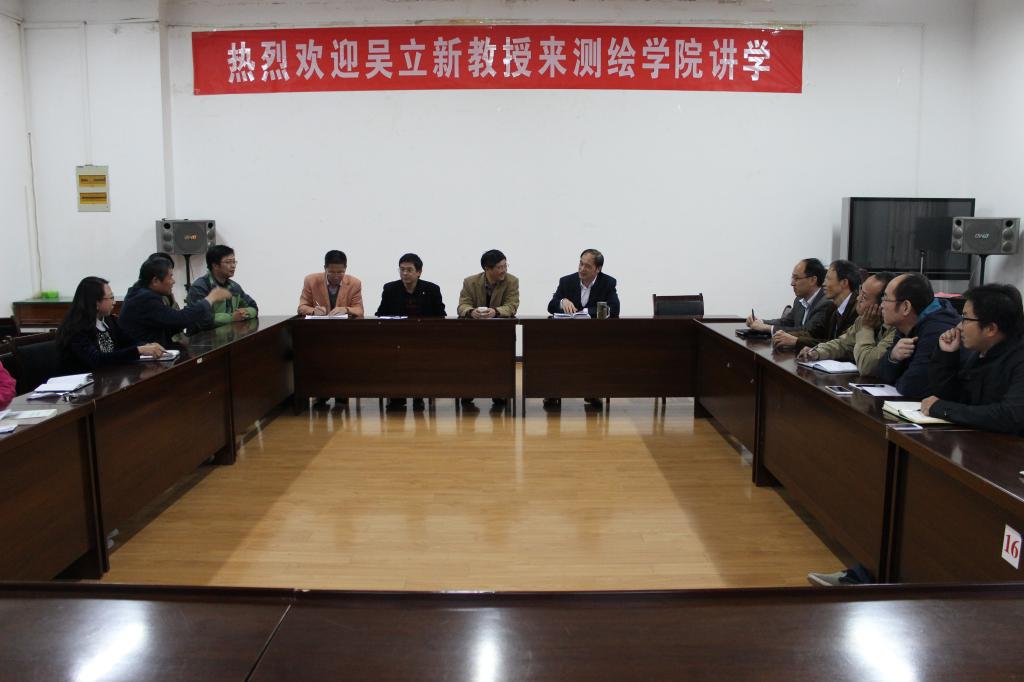 会后,吴立新教授在测绘学院201会议室,与学院教师就测绘学科发展及矿区环境与灾害遥感监测的相关热点问题进行了座谈,并提出学校测绘学科要将现代测绘技术和理论与矿区环境和灾害问题紧密结合,建设具有鲜明特色的测绘学科的理念。