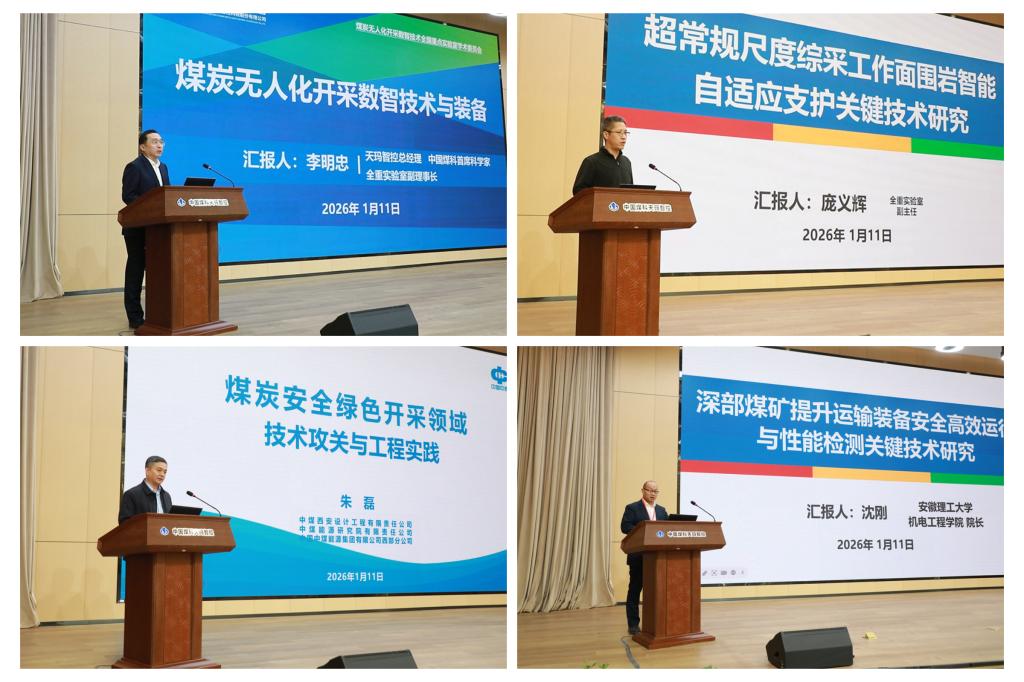 会上,北京天玛智控科技股份有限公司党委副书记、总经理、中国煤科首席科学家、全重副理事长李明忠,煤炭科学研究总院有限公司首席科学家、全重副主任庞义辉,中煤西安设计公司总经理、全重研发中心主任朱磊,安徽理工大学教授、全重研究室主任沈刚,围绕“煤炭无人化开采数智技术与装备”“超常规尺度综采工作面围岩智能自适应支护关键技术研究”“煤炭安全绿色开采领域技术攻关与工程实践”“深部煤矿提升运输装备安全高效运行与性能检测关键技术研究”等主题分别作报告,介绍了个人基本情况、研究背景及意义、主要研究成果与进展以及后续研究方向和任务。