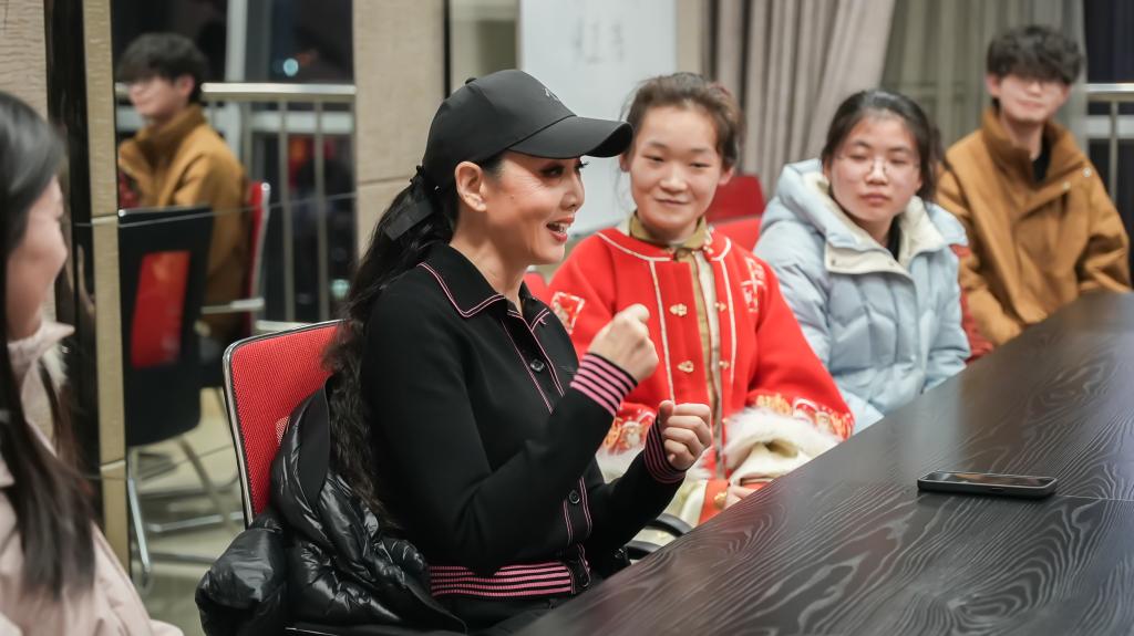 演出落幕,掌声经久不息。韩再芬教授不顾演出疲惫,即刻与25名安理学子围坐一堂,开启了一场温暖而深刻的美育思政课。她结合自身深耕黄梅戏舞台的经历,向学子们解读了中国传统戏曲的精髓,强调传统戏曲不仅是一门表演艺术,更是承载中华优秀传统文化、传递民族精神的重要载体,是中华传统美学的核心所在。黄梅戏的传承与发展,既要守住传统声腔、经典剧目这些“根基”,又要与时俱进、大胆创新,通过创排贴合时代主题的新剧目让传统戏曲与当代社会同频共振。正如《六尺巷宽》所传递的“谦让”精神,在当今社会依然具有强烈的现实意义,能够引导人们正确处理人际关系、化解矛盾分歧,这正是传统戏曲时代价值的生动体现。