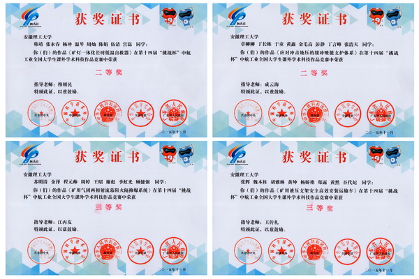 11月16日至22日,第十四届“挑战杯”全国大学生课外学术科技作品竞赛终审决赛在广东工业大学举行。经过网络初评、集中复评、决赛现场展示和问辩等环节,我校《矿灯一体化长时低温自救器》和《应对冲击地压的缓冲吸能支护体系》等2项作品获得全国竞赛二等奖,安徽省高校10项作品获此奖项;《矿用液压支架安全高效安装运输车》和《矿用气固两相射流幕阻火隔抑爆系统》等2项作品获得全国竞赛三等奖。同时,学校获得全国竞赛“优秀组织奖”。