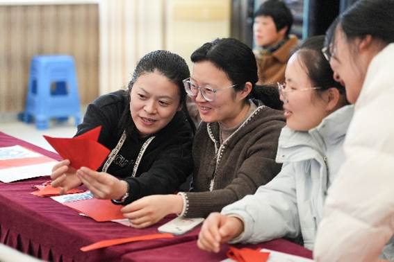 活动现场暖意融融、氛围浓厚。在剪纸过程中,张传锦结合自身经验,为大家带来了生动而有趣的讲解,现场示范对折、刻剪、镂空等技巧。师生们沉浸式体验剪纸的基本技法,从纸张的折叠到剪纸的角度与力度,每一个细节都充满乐趣。在红纸翻飞、剪刀轻舞的欢乐氛围中,师生们共同感受传统文化的独特魅力。