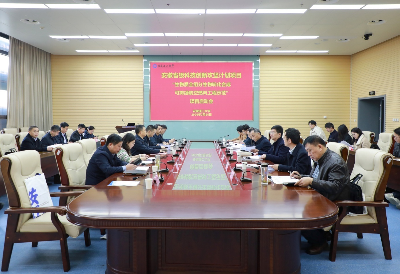 3月25日,由学校牵头承担的安徽省科技创新攻坚计划项目“生物质全组分生物转化合成可持续航空燃料工程示范”启动会,在煤炭无人化开采数智技术全国重点实验室1号会议室召开。淮南市副市长陈长勇,安徽省科技厅农村与社会科技发展中心主任陈雷、生命科学技术处四级调研员许应媛出席会议。校党委常委、副校长张平松出席会议并致辞。