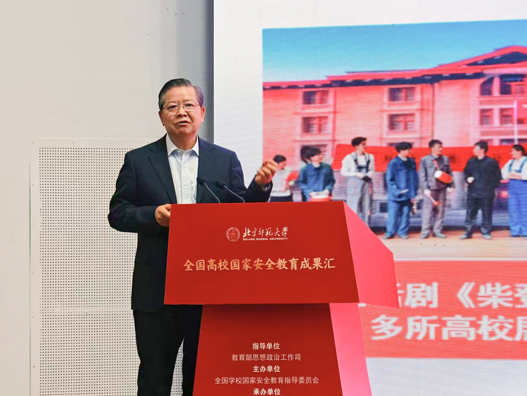 本次成果汇由教育部思想政治工作司指导,全国学校国家安全教育指导委员会主办,北京师范大学承办。教育部思想政治工作司负责同志出席并讲话,北京师范大学党委书记、全国学校国家安全教育指导委员会主任委员程建平致辞。会议集中发布了总体国家安全观20个重点领域专题教学指南,举行了高校教师国家安全教育教学视频征集与现场展示活动启动仪式、国家安全教育大模型发布仪式,以及全国大学生践行总体国家安全观宣讲团成立暨社会实践活动启动仪式。